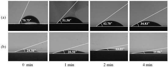 To explore how plasma improved the bonding strength of PM wood, the surface characteristics of PM wood should be emphasized. Wettability of wood is an important parameter used to study the characteristics of the wood surface; it refers to the close bonding degree of liquid adhesive with the wood surface and is generally expressed according to the contact angle. The smaller the contact angle is, the better the wettability is. Generally speaking, the adhesive cannot wet the wood surface if the contact angle is greater than 90°, and, on the contrary, the adhesive can wet the wood surface when the angle is less than 90° [25,26,27].