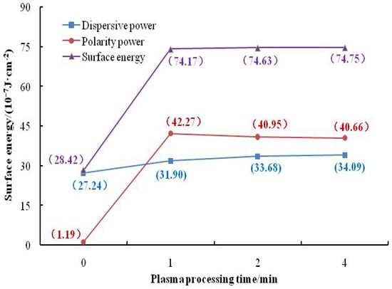 Surface energy consists of the polar force component and the dispersion force component, which are also important for the study of the surface characteristics of materials. It can be seen from Figure 7 that the surface energy of PM wood increased significantly after plasma treatment at 1 min, from 28.42 × 10−7 to 74.17 × 10−7 J·cm−2, but then with the extension of treatment time, the surface energy changed little. The effect of plasma treatment on the polar force was consistent with the change law of surface energy, indicating that the increase in surface energy was mainly caused by the increase in the polar force component. This was because a large number of polar groups were generated on the surface of PM wood after plasma treatment, and when the plasma treatment time was 1 min, the active groups forming on the surface reached saturation, so that the polar force component basically remained unchanged with the extension of treatment time. The orientation force between polar molecules on the wood surface, and the induced force between nonpolar molecules and polar molecules, were enhanced as the polar force increased. This provided the wood surface with enough surface energy to overcome the surface tension of adhesive, so that the adhesive could more easily spread, wet, and permeate on the wood surface.