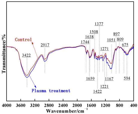 After plasma treatment, the peak at 1271 cm−1 shifted to 1221 cm−1, meaning the increase in syringyl lignin. This indicated the degradation of lignin, and chemical bonds were broken. The peak at 1638 cm−1 shifted to 1659 cm−1, manifesting that the peculiar aromatic ring structure of lignin provided a gathering place for lone pair electrons and plasma oxidated hydroxyl into conjugated carbonyl, which improved electron density and enhanced reactivity [43].