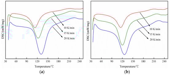 DSC curves at different heating rates. Note: (a) PM wood and MUF adhesive; (b) PM wood with plasma treatment and MUF adhesive.