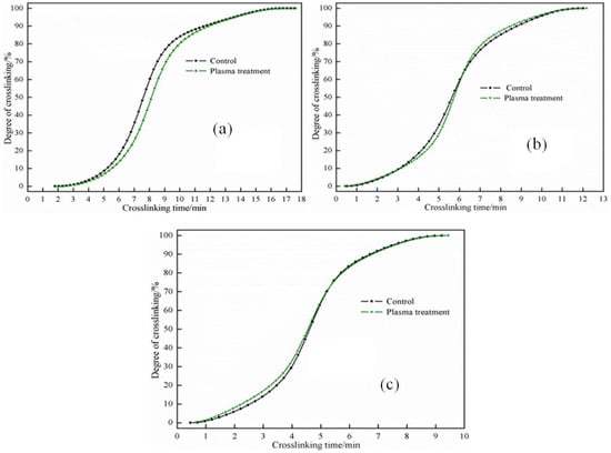 When the heating rate was 10 K/min, the cross-linking reaction rate of PM wood treated by plasma was lower than that of untreated wood. At the heating rate of 15 K/min, the curves of all PM wood samples had an intersection point at about the cross-linking degree of 65%. When the reaction degree was lower than 65%, the cross-linking reaction rate of PM wood after plasma treatment was lower than that of untreated PM wood, and when it was higher than 65%, the situation was the opposite. When the heating rate was 20 K/min, the cross-linking reaction degree curves of PM wood before and after plasma treatment coincided in the range of 60%–100%, and when the reaction degree was lower than 60%, the cross-linking reaction rate of PM wood after plasma treatment was higher than that of untreated wood. This also proved that the surface reactivity of PM wood was enhanced under plasma treatment.