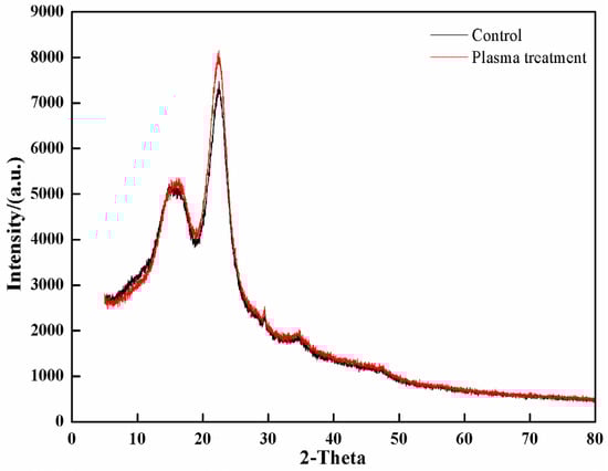 The effect of plasma treatment on 2θ and crystallinity of PM wood cellulose is shown in Figure 12. There were two significant peaks in XRD curves. The maximum diffraction peak was at 2θ = 22°, indicating the maximum intensity of the diffraction angle in the crystalline region (I002). The minimum diffraction peak was at 2θ = 18°, denoting the scattering intensity of the diffraction peak in the non-crystalline region (Iam) [49,50,51]. Before and after plasma treatment of PM wood, the diffraction angle of I002 crystal plane was 22.47°, indicating that plasma treatment had no significant effect on the position of the diffraction peak in the crystalline region, and that the distance of crystal layers was not changed. The crystallinity before treatment was 45.82% and after treatment was 51.21%, indicating the increase in the crystallinity of cellulose was another reason for the improvement in the bonding strength after plasma treatment [9,52,53,54].