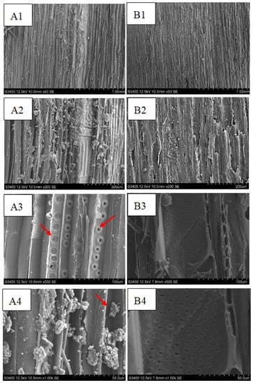 Figure 13 shows the SEM image of the PM wood surface. Without plasma treatment, the surface was smooth (A1), and rosin was dispersed on resin channels and pits (A3). After magnification, it was observed that the pits on the cell wall were covered by rosin (A4) and most pits were closed (A3), indicating the poor wettability of untreated PM wood. After plasma treatment, the smooth surface was etched by plasma to form a linear roughened surface; the structure became denser (B1), the surface rosin and even the rosin around pits were degraded, and some of the originally obstructed pit channels were unblocked (B3 and B4), which could facilitate the deep diffusion, wetting, and permeation of MUF into wood and contribute to the formation of enough glue-nails [9,20].