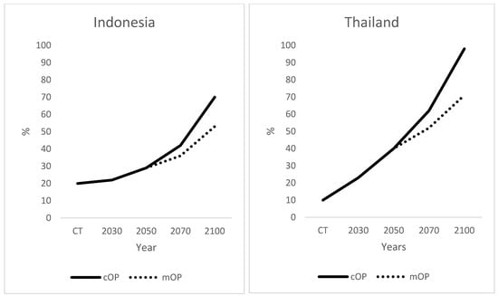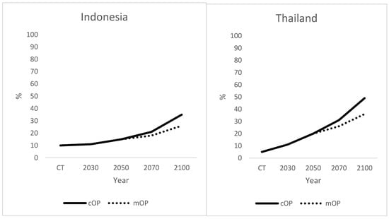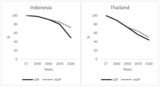 The initial mortalities for OP were 10 and 5% for Indonesia and Thailand, respectively. The increase in mortalities for the subsequent years was considerably less for Indonesia. In Indonesia, the values for 2070 were (a) 20 and 18% for cOP and mOP, and (b) 35 and 26% in 2100 for cOP and mOP. For Thailand, the values for 2070 were 31 and 26% for cOP and mOP, respectively. For 2100, the Thailand data were 49 and 36% for cOP and mOP, respectively.