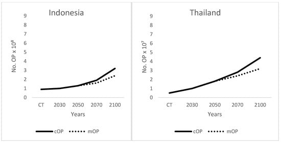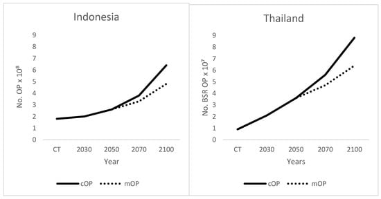 In Figure 4, the numbers of dead OP from BSR infection are demonstrated. The initial number of deaths from BSR were 9.0 × 107 and 5.0 × 106 for Indonesia and Thailand, respectively. Subsequent deaths increased more slowly for Indonesian OP. By 2070, the mortalities were 1.9 × 108 and 1.6 × 108 for cOP and mOP, respectively for Indonesia. These increased to 3.2 × 108 and 2.4 × 108 for cOP and mOP, in 2100. The figures for 2070 in Thailand were 2.8 × 107 and 2.4 × 107 for cOP and mOP, and for 2100 the equivalent figures were 4.4 × 107 and 3.2 × 107.