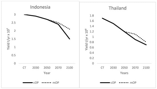 The savings in yields in 2070 from employing mOP in Indonesia was 3% of the current Indonesian yield and may not appear worthwhile. Nevertheless, it represents more than the current yields of PNG or India (Table 3) and is similar to that for Central America and ca. 50% of the total Thailand yield. The yield saved in 2100 was 20% of the current Indonesian yield and appears a substantial quantity and worth the investment in mOP technology. This saving is much higher than the current yields of Africa, South America, Thailand, Central America, PNG, or India and is ca. 30% of the total current yield of Malaysia. The saving in yield from using mOP for 2070 and 2100 for Thailand was 5% of the total current yield of Thailand. This is a small gain from planting mOP, although this amount is the same as the current yield of India which may be considered worthwhile.
