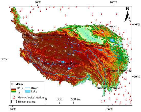 The Tibetan Plateau is located in the southwest of China (26°00′ N~39°50′ N, 73°20′~104°50′, Figure 1), with a total area of 2.50 × 106 km2. The terrain of the Tibetan Plateau is low in the east and high in the west, with an average altitude of more than 4000 m. The climate is dry and windy in winter and cool and rainy in summer, with strong solar radiation. There are five rivers and four lakes, including the Yangtze River, the Yellow River, the Lancang River, the Yarlung Zangbo River, the Nujiang River, the Qinghai Lake, the Selin Lake, the Nam Co and the Bangong Lake. The land-use structure is extremely uneven. The area percentage of unsuitable land for cultivation is 34.5%, while that of suitable land for cultivation (such as agricultural crops, cash crops, etc.) is only 0.9% [27]. Due to the combined effects of climate types and topographic features, the vegetation types of the Tibetan Plateau are diverse. The main types are alpine shrubs, alpine meadows, alpine grasslands and alpine grasslands.
