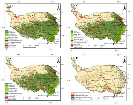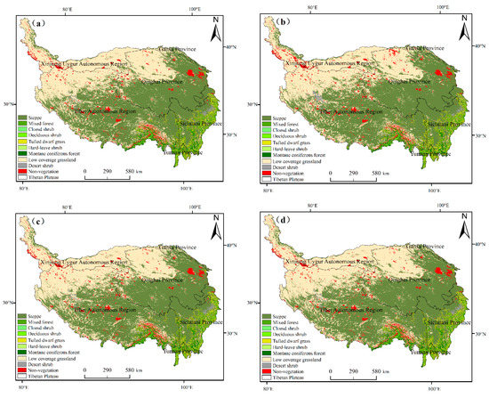 Spatial distribution and changes in vegetation types in the Tibetan Plateau. (a) 2000; (b) 2010; (c) 2020; (d) 2000–2020.