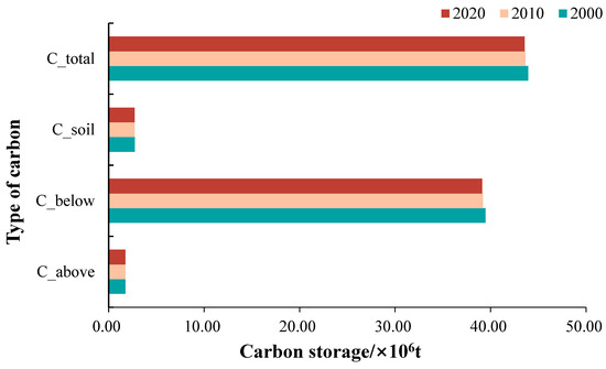 This study used the Carbon Storage and Sequencing module of the InVEST model to calculate the carbon storage of the Tibetan Plateau in 2000, 2010 and 2020, with 43.94 × 106 t, 43.6543.94 × 106 t and 43.5643.94 × 106 t as the results, respectively. During 2000–2020, the total carbon storage showed a decreasing trend, with a decrease of 0.37 × 106 t compared to that of 2000 (Figure 3). During 2000–2020, the type of carbon storage in the Tibetan Plateau was mainly underground carbon storage, at 39.45 × 106 t, 39.19 × 106 t and 39.11 × 106 t, accounting for 89.80%, 89.78% and 89.77% of the total carbon storage, respectively. From the overall changes in carbon storage in the Tibetan Plateau, due to the reduction of aboveground carbon storage, underground carbon storage and soil carbon storage in different degrees, the carbon storage had generally shown a decreasing trend. The aboveground carbon storage, underground carbon storage and soil carbon storage decreased by 0.01 × 106 t, 0.34 × 106 t and 0.02 × 106 t, respectively.