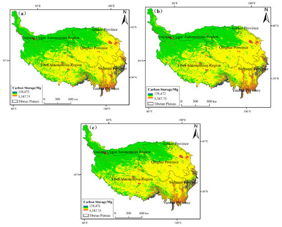 Spatial distribution of carbon storage in the Tibetan Plateau during 2000–2020. (a) 2000; (b) 2010; (c) 2020.