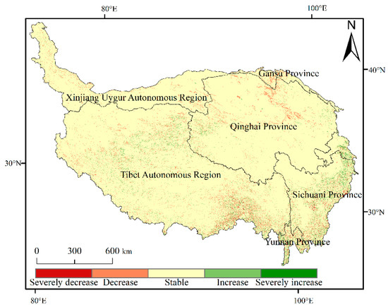 During 2000–2020, a total area of 190,487.75 km2 changed in the Tibetan Plateau, accounting for 7.49%. The area of vegetation degradation was 78,442.25 km2, while that of vegetation optimization was 112,045.50 km2. Vegetation degradation zones were mainly distributed in Gaer County, Shigatse City, Nagqu County and Linzhi County of the Tibet Autonomous Region, Kangding County, Malkang County and Xichang City of Sichuan Province, and the Nujiang Li Autonomous Prefecture of Yunnan Province. The area of steppe degradation was the largest, accounting for 42.90% of the degradation zones. This was followed by that of low-coverage grassland degradation–no vegetation, with an area of 14,725.25 km2. The vegetation optimization area was mainly distributed in Jiuquan City of Gansu Province, Ulan County of Qinghai Province, Malkang County, Kangding County, Xichang City of Sichuan Province and Linzhi County of the Tibet Autonomous Region. The area of low-coverage grassland optimization was the largest with steppe, at 60,945.00 km2, accounting for 54.39% of the optimization area. This was followed by steppe optimization–desert shrub, with an area of 12,579.50 km2.
