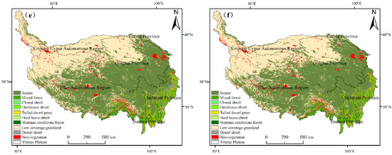 Prediction of vegetation type distribution in the Tibetan Plateau under different scenario constraints in 2030 and 2060. (a) Inertia development scenario in 2030; (b) inertia development scenario in 2060; (c) farmland protection scenario in 2030; (d) farmland protection scenario in 2060; (e) ecological priority development scenario in 2030; (f) ecological priority development scenario in 2060.