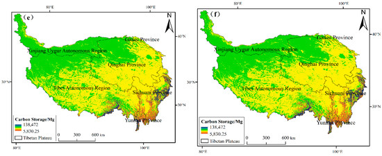 Prediction of carbon storage distribution in the Tibetan Plateau under different scenario constraints in 2030 and 2060. (a) inertia development scenario in 2030; (b) inertia development scenario in 2060; (c) farmland protection scenario in 2030; (d) farmland protection scenario in 2060; (e) ecological priority development scenario in 2030; (f) ecological priority development scenario in 2060.
