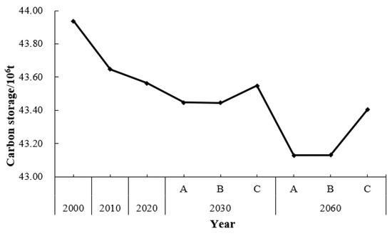 The change in carbon storage in the Tibetan Plateau during 2000–2060. Note: A was Inertia development scenario, B was farmland protection scenario, C was ecological priority development scenario.