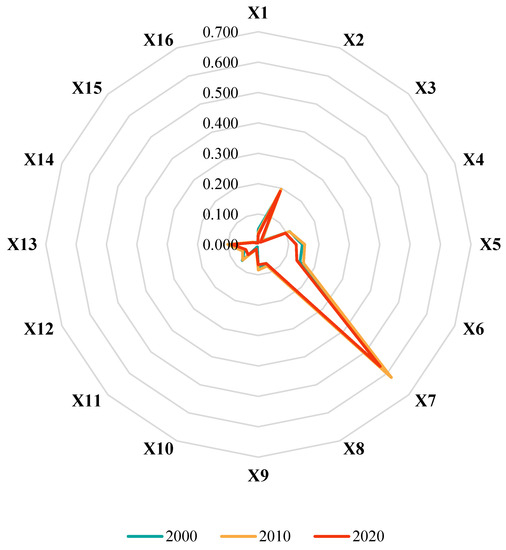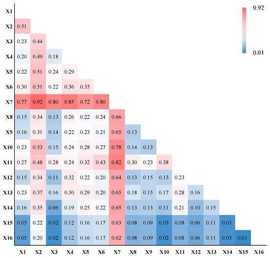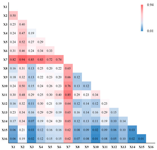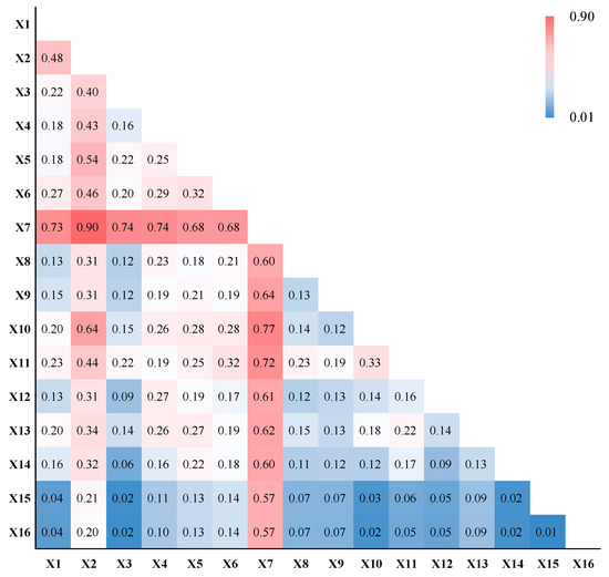 Explanatory power of different single factors on carbon storage changes in the Tibetan Plateau during 2000–2020. X1 is slope, X2 is DEM, 3 is aspect, X4 is temperature, X5 is hours of sunshine, X6 is precipitation, X7 is FVC, X8 is distance to woodland, X9 is distance to river, X10 is distance to lake, X11 is distance to grassland, X12 is distance to farmland, X13 is distance to town, X14 is distance to road, X15 is GDP, X16 is POP.