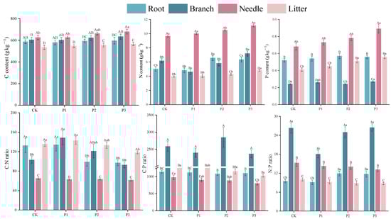 For the content of C, P3 treatment only increased the content of C in the needle (p ≤ 0.05). The content of N in the branch, needle, and litter and the content of P in the branch and needle with P3 treatments were vastly larger than those obtained with the other treatments. The content of N in the root and the content of P in the litter with the P2 and P3 treatments were larger than those of the P1 and CK treatments. In addition, the C:N ratio of roots with the P2 and P3 treatments (98.77, 96.93, respectively) was lower than that of the CK and P1 treatments (132.55 and 134.08), while the N:P ratio (11.89, 11.74, respectively) was higher than that of the CK and P1 treatments (9.51 and 9.14) (Figure 2).