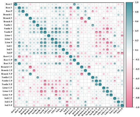 Pearson correlation analysis of C, N, and P content and stoichiometry in slash pine plantation. * means p ≤ 0.05; ** means p ≤ 0.01.
