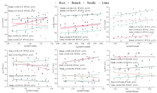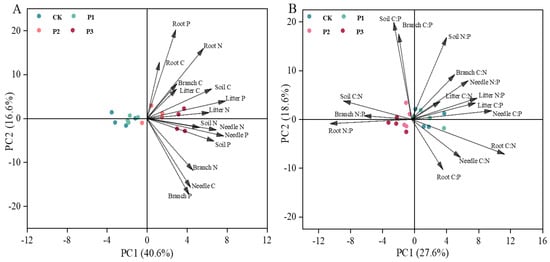 Overall, the contents of C, N, and P in branch and needle were positively correlated with the C, N, and P contents of soil (Figure 3). Specifically, the N and P contents of needle were positively correlated with the C and P contents of soil. In addition, the relationship between the C:N:P ratios of litter and needle and the C, N, and P contents of soil were negatively correlated. The principal component analysis (PCA) showed that the N and P contents of needle and litter were correlated with the C and P contents of soil in the plant–litter–soil system with the P2 and P3 treatments. Moreover, the soil N had a positive influence on the needle N content (Figure 4A). The C:P and N:P ratios of litter were positively correlated with the C:P and N:P ratios of needle, while the C:N and N:P ratios of root were negatively correlated with the C:N and N:P ratios of branch (Figure 4B).