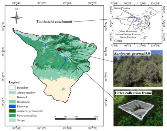 The Qilian Mountains are located in the Gansu and Qinghai provinces of China and are one of the prominent mountains. The experimental site is located in the Tianlaochi catchment (38°23′58″–38°26′56″ N, 99°53′50″–99°57′10″ E) of the central Qilian Mountains (Figure 1). The catchment covers an area of 12.8 km2, and an elevation of 2650–4450 m. The mean annual temperature of the catchment is 0.6 °C. The relative humidity is 59%. The mean annual precipitation is 535.9 mm from 2014 to 2019 [26]. The precipitation concentrated from May to September, more than 80% occurred during the whole year. The climate is classified as semi-arid alpine [27]. The dominant vegetation types are Picea crassifolia, JP, Potentilla fruticasa, Spiraea alpina Pall, Caragana jubata, and Salix gilashanica. With the elevation increasing, the distribution of vegetation types formed a significant vertical differentiation law. From high to low elevation, there are meadows, shrubs, forests, and grasslands. Forest is the main ecosystem in the catchment. The dominant forest species are Picea crassifolia and JP. The area of the two forests is 3.25 and 1.71 km2 [26,28]. JP is sensitive to climate change but can adapt to harsh environmental conditions and tolerate cold and drought. In the Qilian Mountains, JP occupies 13.34% of the land area of the catchment and is widely distributed on the sunny slopes at the elevation of 2700–3250 m [27]. JP can reach 12 m tall and live for more than 100 years.