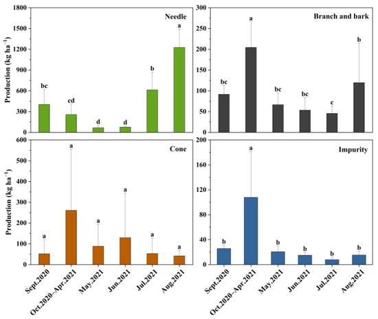 Monthly dynamics of litter production (needle, branch and bark, cone, and impurity) of JP from September 2020 to August 2021. The error bar represents the standard deviation (n = 6). Lowercase a, b, c, and d denote significant differences between the different months (Tukey, p < 0.05).