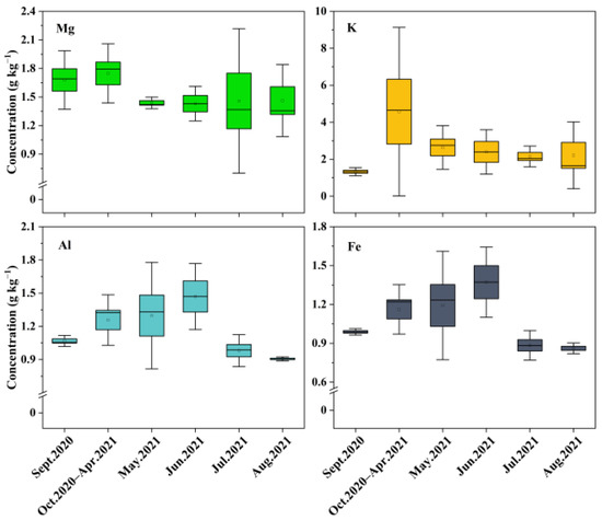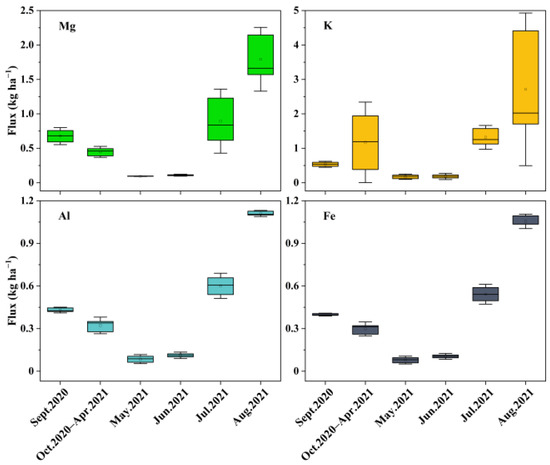 In Figure 4, the needle litter of JP exhibited the highest fluxes in K, followed by Mg, Al, and Fe. These MEs showed a consistent trend throughout the year, with their monthly fluxes decreasing in the following order: August > July > September > October–April > June > May. Significantly higher fluxes of K (2.71 ± 1.48 kg ha−1), Mg (1.79 ± 0.31 kg ha−1), Al (1.11 ± 0.01 kg ha−1), and Fe (1.05 ± 0.03 kg ha−1) were observed in the needle litter during August compared to other months (p < 0.05). On the other hand, significantly lower fluxes of K (0.17 ± 0.05 kg ha−1), Mg (0.09 ± 0.01 kg ha−1), Al (0.09 ± 0.02 kg ha−1), and Fe (0.08 ± 0.02 kg ha−1) were observed in May compared to other months (p < 0.05).