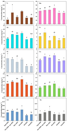 Concentrations of TEs (Na, Cr, Mn, Co, Ni, Cu, Zn, Ag, Cd, and Pb) in needle litter of JP from September 2020 to August 2021 (n = 6). The error bar represents the standard deviation. Lowercase a, b, c, and d denote significant differences between the different months (Tukey, p <0.05).