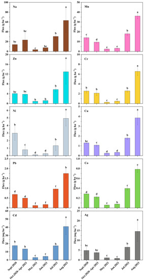 Fluxes of TEs (Na, Cr, Mn, Co, Ni, Cu, Zn, Ag, Cd, and Pb) in needle litter of the JP from September 2020 to August 2021 (n = 6). The error bar represents the standard deviation. Lowercase a, b, c, d, e and f denote significant differences between the different months (Tukey, p < 0.05).