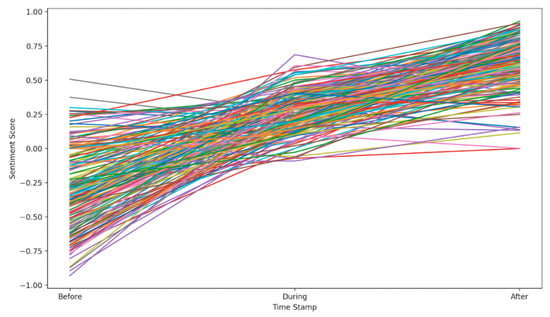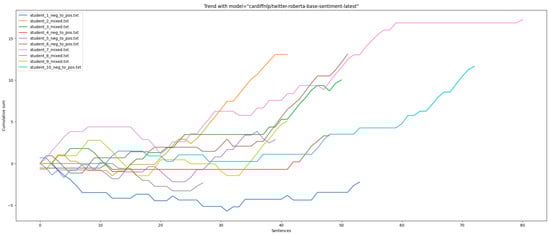 The sentiment score charts resulting from each model were then evaluated against each other and against the authors’ perceptions. Our findings indicated that the most suitable model for this work was the roBERTa model, trained on 58 million tweets and tweaked specifically for sentiment analysis. The roBERTa model is available on the Hugging Face website [].