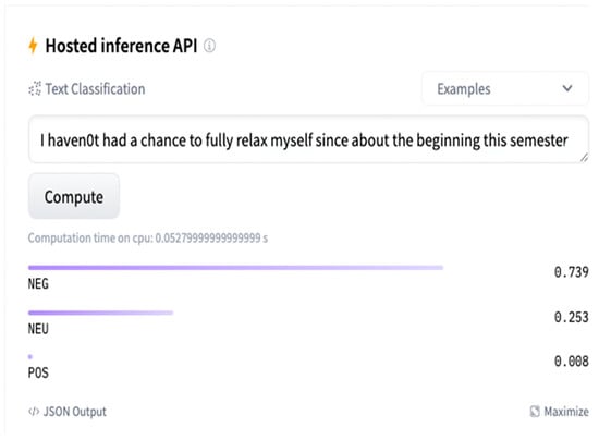 Figure 2. Example of the output from the “Hugging Face” model for one sentence. - Using the sentences highest sentiment probability, sentences with a negative sentiment were assigned a negative sign label, neutral sentiments were assigned a zero label, and positive sentiments were assigned a positive sign label.