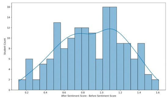 The combined score of each reflection’s before sentences minus the combined score of the after sentences is plotted in Figure 6. The plot is normally distributed, showing the differences among the students’ forest bathing experiences. The graph indicates that some students felt more negative at the beginning of the forest bathing assignment, and others felt more positive. However, despite their initial feelings, all students wrote more positively when reflecting on how they felt after the forest bathing experience.