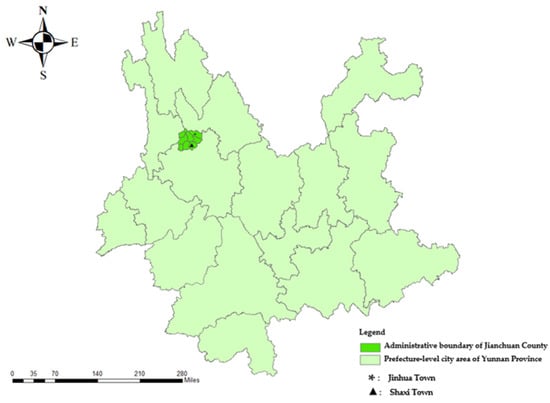 Jianchuan County is a county seat largely considered the country’s national garden, with a forest coverage rate of 74.5%, located in the northwest of Yunnan Province and the north of Dali Prefecture, with Heqing County (Dali Bai Autonomous Prefecture, Yunnan Province, China) in the east and Lijiang City (Yunnan Province, China) in the north. It has a mountainous area of nearly 90% of the territory, and 96.2% of the county’s population is composed of minorities. The Bai people account for 91.2% of the total population (Figure 1). Jinhua and Shaxi are the two most populous townships (communities) in Jianchuan County, and are rich in woodland resources. The Jinhua area (Jinhua Town, Jianchuan County, Dali Bai Autonomous Prefecture, Yunnan Province, China) is dominated by public welfare forests, while Shaxi Town (Jianchuan County, Dali Bai Autonomous Prefecture, Yunnan Province, China) has timber forests, economic forests, charcoal forests, protective forests, and other multi-purpose forests.
