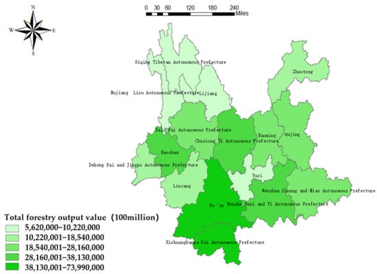 The case sites are located in states with abundant forest resources, and the data of the total forestry output value of each state and city were collated and divided from the 2021 Yunnan Statistical Yearbook. The two states are in the middle to upper class, with sufficient endogenous power for forestry industry development; thus, the study of behavior and willingness of the ethnic minority forest landowners to engage in forest land management is somewhat representative (Figure 3).