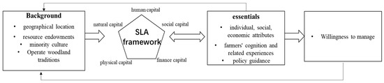 The Sustainable Livelihoods Analysis (SLA) framework is a research tool based on the British Development Agency, which has been widely used in the analysis of livelihood vulnerability [44] and poverty [45]. It also considers the influencing factors and willingness to manage from the perspective of farmers, [46] which intuitively reflects the problems and needs at the micro-level. William D. Sunderlin summarized the study of rural livelihoods, such as forest resource protection, utilization, and poverty reduction measures practiced in developing countries [47]. Nimai Das studied the impact of participatory forestry programs on rural livelihood sustainability outcomes in poor households in India [48]. The sustainable livelihood framework is also used as a research tool for the sustainable development of grassland ecosystems [49], the implementation effect of the grassland ecological compensation policy [50], joint forest management [51], and other fields related to forestry ecological development. Therefore, in the existing research, the application of the SLA framework in the field has been more common and extensive. The research areas are mostly concentrated in poverty-stricken and remote minority regions [52]. The research content mostly focuses on the livelihood status of farmers and the livelihood factors that affect the income level or behavior of farmers. Few studies have been conducted on key ecological functional areas such as Yunnan Province, and there are few studies on the influencing factors of the SLA framework for the willingness of ethnic minority forest landowners to engage in forest management.