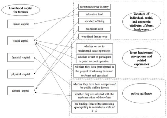 Therefore, according to the SLA framework and combined with the field survey results, we used the following factors: forest landowners’ identity, education level, living standard, forest land area, and forest land function type as indicators of the influence of the forest landowners’ individual level, economic level, and social level on the willingness to manage forests. These determine the forest landowners’ management efficiency and perception of management risk. At the same time, the perceptions of joint-family operation and large-scale management, and the participation in the project of returning farmland to forests and grasses were also used as variables influencing the forest landowners’ perceptions and related experience levels regarding management intentions. In addition, the three variables of compensation for public welfare forests, satisfaction with the collective forest rights system reform, and the strength of harvesting limit policy constraints also reflect whether policy guidance has a subjective-level effect on the ethnic minority forest landowners’ management intentions.
