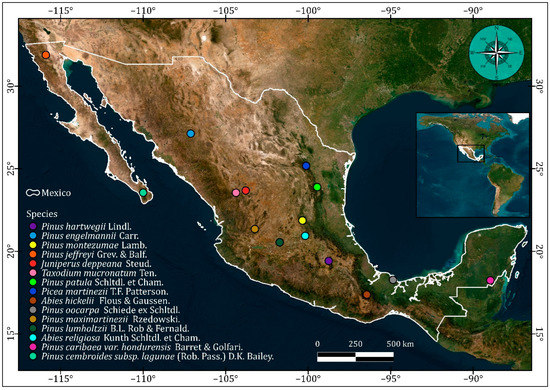 - Contreras-Medina, R.; Luna-Vega, I. Species richness, endemism and conservation of Mexican gymnosperms. Biodivers. Conserv. 2007, 16, 1803–1821. [Google Scholar] [CrossRef]
