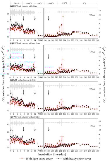 3.2. Effect of Snow Cover and the Presence of Litter on CO2 Emissions from Soil Columns