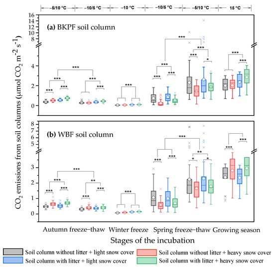 Xu, X.; Wu, H.; Yue, J.; Tang, S.; Cheng, W. Effects of Snow Cover on Carbon Dioxide Emissions and Their δ13C Values of Temperate Forest Soils with and without Litter. Forests 2023, 14, 1384. https://doi.org/10.3390/f14071384