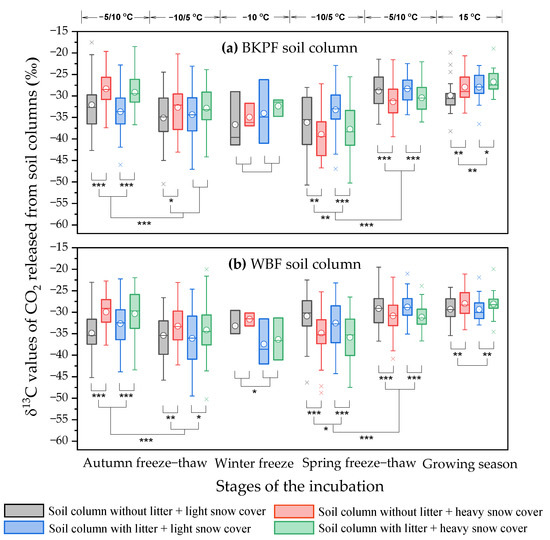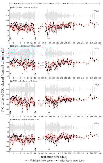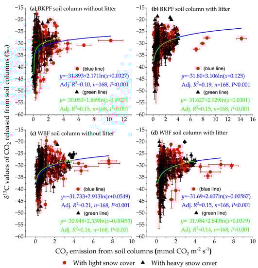 Effects of Snow Cover on Carbon Dioxide Emissions and Their δ13C Values of Temperate Forest Soils with and without Litter