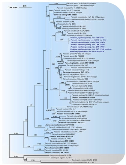 Phylogenetic tree of Parasola species based on Bayesian Inference (BI) and Maximum Likelihood (ML) analyses of the concatenated four-gene (ITS, LSU, tef-1α, β-tub) sequence alignment. Significant branch support values, Bayesian posterior probability (BI-PP ≥ 0.95), and ultrafast bootstrap support (ML-BP ≥ 70%) are presented at the nodes. Collections with newly generated sequences are marked in bold and the newly proposed species P. papillatospora is marked in a blue color.