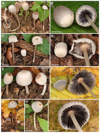 Parasola papillatospora sp. nov. Basidiomata. (A,B) CNF 1/7858, holotype. (C,D) CNF 1/5428. (E) CNF 1/7600. (F,G) CNF 1/7902. (H,I) CNF 1/7861. Bars: (A,C,E,G,H) = 10 mm; (B,D,F,I) = 5 mm. Photos: M. Čerkez.