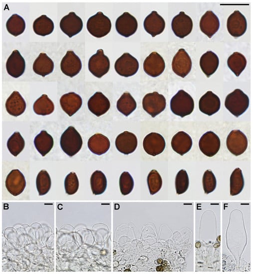 Parasola papillatospora sp. nov. (A) Basidiospores in NH4OH. (B–D) Cheilocystidia. (E,F) Pleurocystidia. Bars = 10 µm. Photos: Z. Tkalčec and A. Mešić.