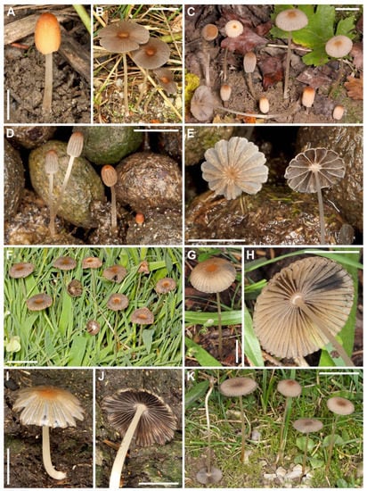 Basidiomata of Parasola species new to Croatia. (A,B) P. auricoma CNF 1/4718, 1/4618. (C) P. crataegi CNF 1/8905. (D,E) P. cuniculorum CNF 1/5143. (F) P. malakandensis CNF 1/8698. (G,H) P. megasperma CNF 1/5704. (I,J) P. nudiceps CNF 1/4804. (K) P. plicatilis-similis CNF 1/5484. Bars: (A,D,E) = 5 mm; (B,F,K) = 20 mm; (C,G–J) = 10 mm. Photos: M. Čerkez.