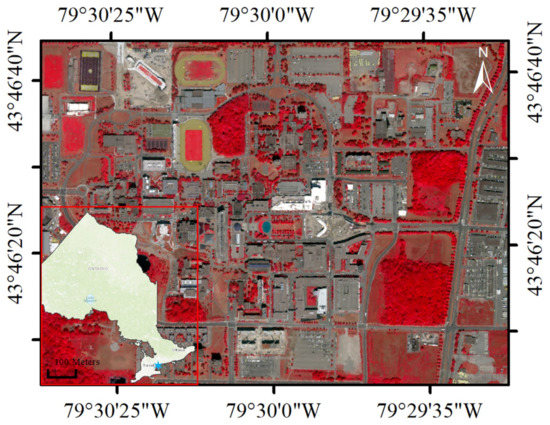 This study was conducted at the Keele Campus (43.77° N, 79.50° W) of York University, which is situated in the Greater Toronto Area, Ontario, Canada. The campus spans 457 acres of land and provides an urban setting for tree species classification (Figure 1). For this study, five dominant tree species were selected: Norway maple (Acer platanoides), honey locust (Gleditsia triacanthos), Austrian pine (Pinus nigra), white spruce (Picea glauca), and blue spruce (Picea pungens).