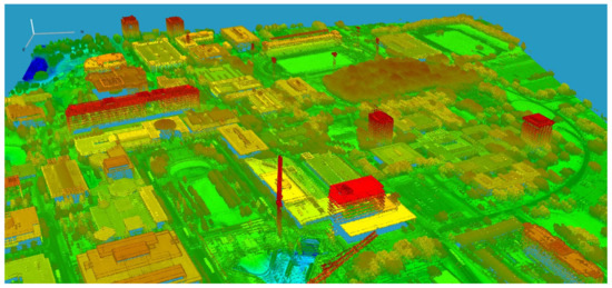 The LiDAR data provided by the York University Map Library was acquired in April 2015 during the early spring leaf-off conditions. The data set was collected using a Leica ALS70-HP discrete return LiDAR system mounted on an aircraft flying at 160 knots (82.3 m/s). The acquisition flights were undertaken at an altitude of 800 m AGL (above ground level) with the laser pulse rate set at 300,000 Hz, resulting in four discrete returns and an aggregated point density of 10 points per square meter. The horizontal and vertical accuracies of the LiDAR data were 30 cm and 10 cm, respectively. To create the CHM, also known as the normalized digital surface model (nDSM), the LiDAR data was processed by obtaining the difference between a digital elevation model (DEM) and a digital surface model (DSM) using MATLAB (Version 2020a, The Math Works, Inc., 2020). A 3D perspective view of the LiDAR point cloud is presented in Figure 3.
