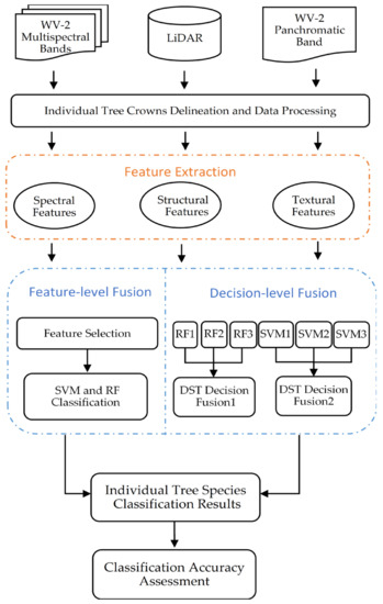 Taking advantage of these multiple features extracted from the abundance of data provided by various sensors (e.g., high-resolution multispectral, hyperspectral, and LiDAR systems), researchers have recognized the potential benefits of integrating multisource data to improve the performance of tree species classification [5,11,12,22,23,24,25,26]. Fusion-based classification approaches have gained considerable attention in recent years and continue to be an active area of research. Extensive utilization of multisource remotely sensed data was found to be effective in improving the separation of tree species by leveraging the complementary information available from different scenarios. Most recent studies that employed fusion approaches incorporated multisource data at the feature level [11,12,13,22,23,24,25,27]. For example, Liu et al. [25] employed LiDAR in a combination of hyperspectral imagery to classify 15 common urban tree species using an RF classifier, resulting in an increased accuracy of 70% using feature fusion. Nevertheless, the high dimensionality in the feature space that results from feature-level fusion is likely to be a concern for applications where the size of training samples is small [28]. In addition, features derived from different data sources are treated equally by the SVM and random forest methods, even though some data sources may be more reliable than others [29]. On the other hand, several studies recently investigated fusion at the decision level for species classification, demonstrating the advantages of decision fusion over feature fusion [16,18,29]. Stavrakoudis et al. [18] mapped five forest species using the combined hyperspectral and multispectral imagery, and they showed that the decision fusion exhibited a higher degree of flexibility and accuracy than the feature fusion. Aval et al. [16] and Hu et al. [29] also highlighted that it was important but difficult to define an appropriate decision rule to merge different data sources. An in-depth analysis of decision fusion approaches is needed to realize its potential in species classification.