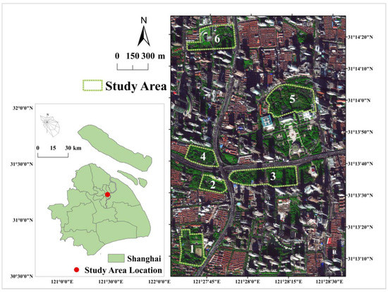 Map of geographical location of study area. The numbers 1-6 in the figure represent the names of the sample blocks of urban PGSs in the study area. The names and composition profile of the blocks are listed in Table 2.
