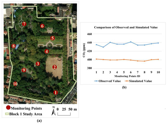 Many scholars have used ENVI-met to conduct microclimate studies and verified the validity of the simulation results [61,62,63,64]. In this study, the simulation results of ENVI-met were compared with the observed values to verify the validation of the software on CO2 concentration. Fuxing Park, one of the research objects, was selected as the measured site, and 10 monitoring points were arranged (Figure 2). A CO2 real-time measuring instrument and a hand-held meteorological instrument were used to measure the meteorological indices and CO2 concentration at 1.5 m above the ground seven times at ten sites between 8 a.m. and 18 p.m. on 18 September 2022. Finally, the average value of seven measurements at each point was taken as the measured value of CO2 concentration at that point to verify the simulated data.