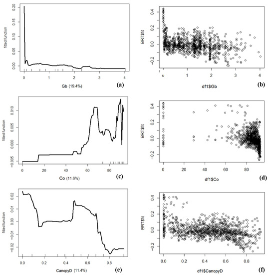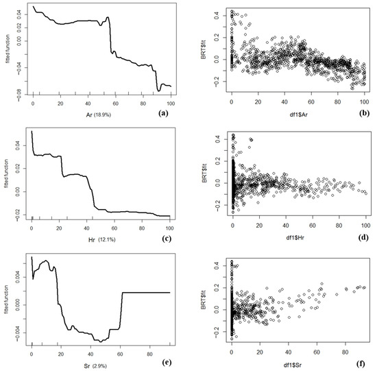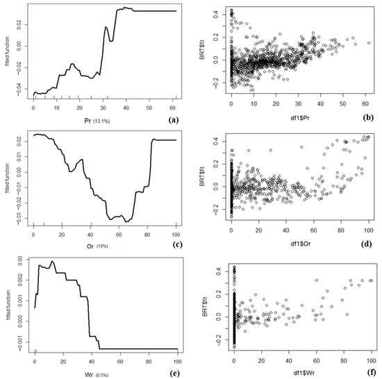 The BRT model is a self-learning method based on categorical regression trees, developed by Elith et al. in 2008. It uses boosting techniques to fit multiple decision trees to determine the optimal model [66]. Compared with traditional regression models, the BRT model has strong adaptability to datasets and can process continuous data and classified data. In addition, the BRT model is not sensitive to multiple linearity and does not need to consider the multicollinearity problems faced by multiple linear regression analysis and can reflect the interaction between variables.