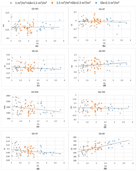 Scatter plot of the relationship between Gb, PAR, and CanopyD: (a) Gb and PAR; (b) Gb and CanopyD.