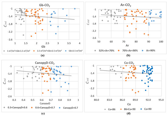 BRT analysis results of atmospheric CO2 concentration () and spatial patterns indices after unit space standardization are shown in Table 6. For green space structural variables, Gb plays the most important role (19.44%). In the green space structural variables, Co (11.60%) and CanopyD (11.36%) both have a higher contribution ratio. In the green space composition variables, the contribution ratio of Ar is 18.90%, ranking first among green space composition indices. The contribution ratios of Hr and Pr ratio are 12.14% and 13.13%, respectively. After that, the ratios of Or (10.03%), Sr (2.86%), and Wr (0.53%) are successively followed.